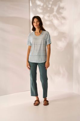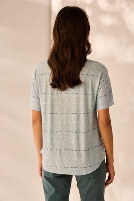 A printed stripe adds a playful character to this relaxed fit tee in a soft linen jersey. The dropped shoulder and curved hemline complete the flattering, modern shape. The Lania signature crystal bead at the centre back neckline adds a little sparkly detail.