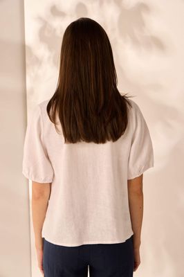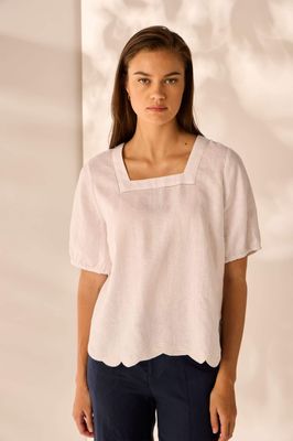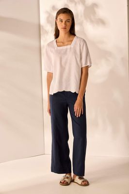 A delicate lace embroidery mirroring the square neckline creating a feminine vibe on the Marlo Top. A soft embroidery design along hemline balance out the elasticated sleeves. Pair with any linen bottoms or jeans for an elevated look.