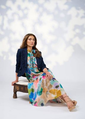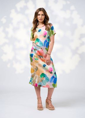 A luxe t-shirt style dress, in a silky printed stretch viscose. With bust darts, back neck opening and side splits to elevate.