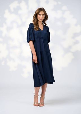 Midi dress with a V neckline and shaped front waist design and turned back elasticated cuffs.  Featuring smocking tuck detailing on the shoulders to elevate the style.