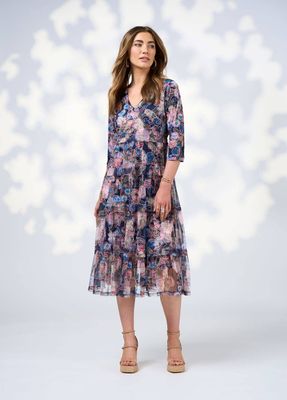 Printed tiered tulle dress with a V neckline and 3/4 length sleeves. Gathered tiers feature a tuck at the top edge of seams. Fully lined.
