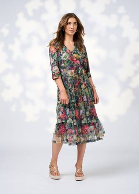 Printed tiered tulle dress with a V neckline and 3/4 length sleeves. Gathered tiers feature a tuck at the top edge of seams. Fully lined.
