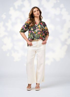 Floaty top in a silk cotton, with a ruched V-neckline and ruffle raglan seams, with elasticated cuffs.