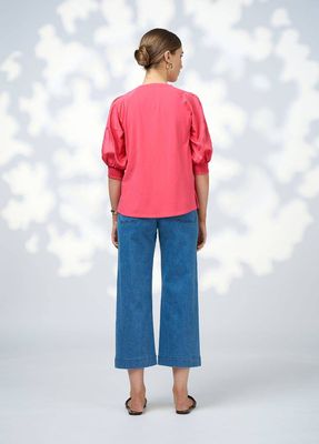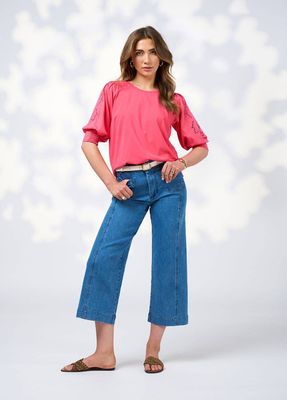 Easy fitting tee with a crew neckline, and shoulder tucks, with half shirred cuffs. Featuring soft lustred cotton sleeves with exclusive cut work embroidery detail.
