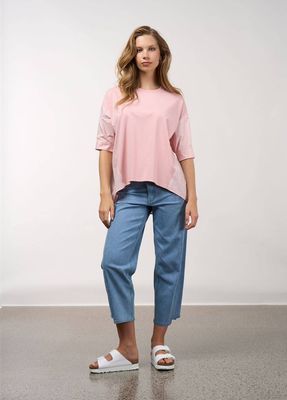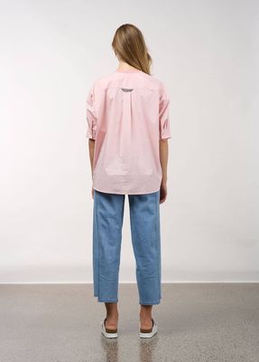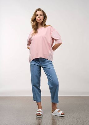 Relaxed fitting top with a soft cotton jersey front and a cotton poplin back, and sleeves. Featuring forward angled side seams and 3/4 length sleeves with partially elasticated button up cuffs.